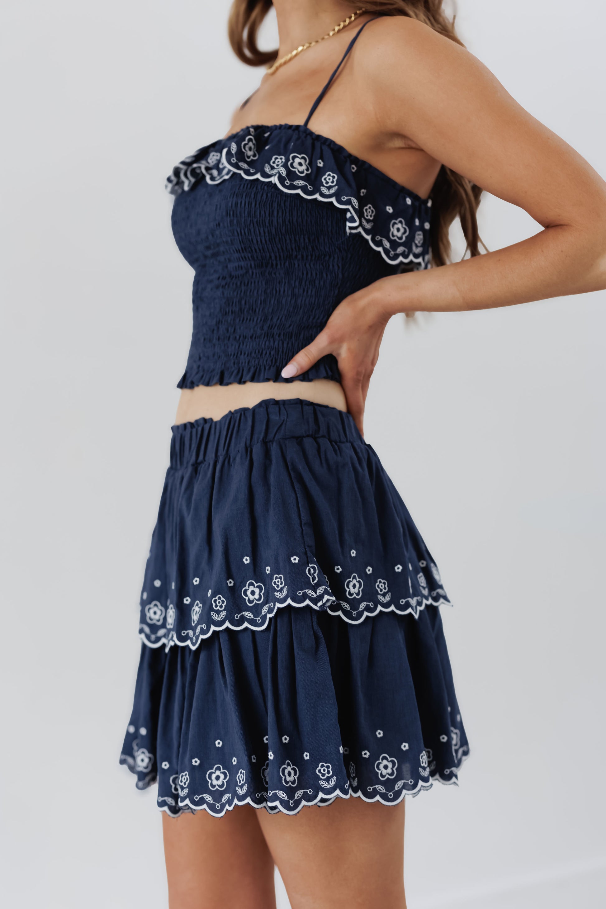 You are going to love the "Real Moment Skort!" This skort is so playful and is perfect for bringing on your next vacation! It features an elastic waistline with double ruffled layers throughout. Each layer is adorned with white floral details that give it the perfect touch of spring! To style, pair with the "Real Moment Top!"