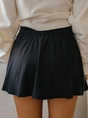 Introducing the "Court Club Skirt" in black! This athletic skirt is so trendy and fun for any sporty endeavors! It boasts an elastic waistline with bow detail, along with a flared mini skirt. The white sporty stripe on either side offers an extra touch of added flair!